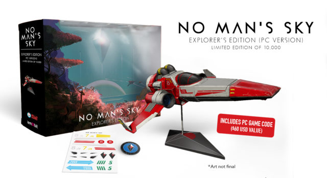 Finally, No Man’s Sky has a price and release date marked for June 21st. If you are the type that prefers to buy a games special edition bundle for the goodies they have inside then No Man’s Sky “Explorer’s Edition,” is there for you to spend your money on. The No Man’s Sky “Explorer’s Edition,” is a limited-run (10,000) version of the game sold exclusively by iam8bit that come with a hand-painted cast metal space ship, an enamel pin, a “diorama display backdrop,” and a “mystery item” with a $10 value. That’s not all you’d be getting for the $149.99 price tag, there’s also PC game code for Steam or GOG. If you don’t want to feel guilty spending that amount on a special edition bundle, iam8bit says the individual components are worth $210.