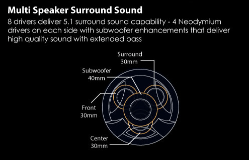 • Multi Speaker Surround Sound Design. 8 Drivers Deliver 5.1 Surround Sound. 4 Neodymium Drivers on Each Earcup