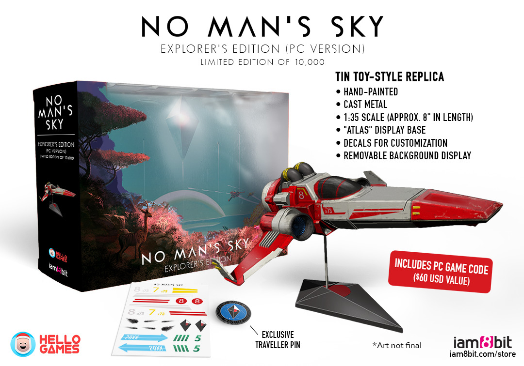 Finally, No Man’s Sky has a price and release date marked for June 21st. If you are the type that prefers to buy a games special edition bundle for the goodies they have inside then No Man’s Sky “Explorer’s Edition,” is there for you to spend your money on. The No Man’s Sky “Explorer’s Edition,” is a limited-run (10,000) version of the game sold exclusively by iam8bit that come with a hand-painted cast metal space ship, an enamel pin, a “diorama display backdrop,” and a “mystery item” with a $10 value. That’s not all you’d be getting for the $149.99 price tag, there’s also PC game code for Steam or GOG. If you don’t want to feel guilty spending that amount on a special edition bundle, iam8bit says the individual components are worth $210.